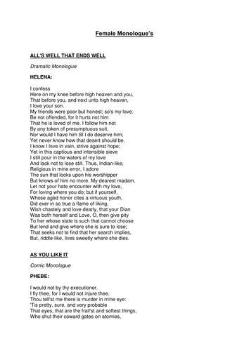 Popular Monologues For Females Popular Monologues For Females : Monologues for girls from movies, play, theatre, television & stand alone monologues.