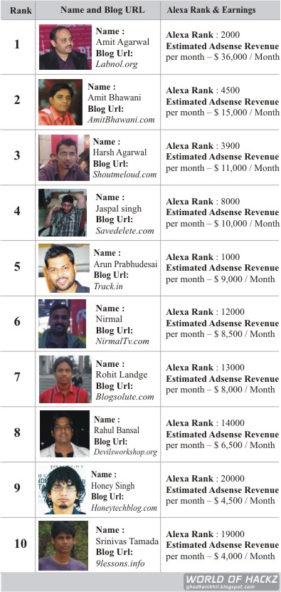 World Of Hackz Top 10 Bloggers In India And Their Adsense Earnings Per Month - With such traffic and niche, his monthly earning in adsense alone as per monster insights are around.